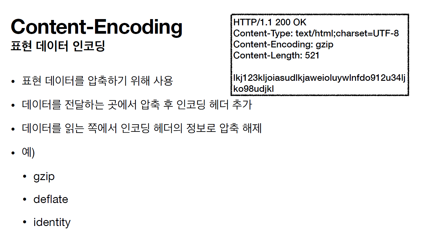 - 서버에 데이터를 요청해서 받아오는 데이터가 만약에 압축되어있다면 압축정보가 gzip, deflate, identity 무엇으로 압축되어있는지 알아야 확인 가능하니 인코딩 헤더에 명시한 것