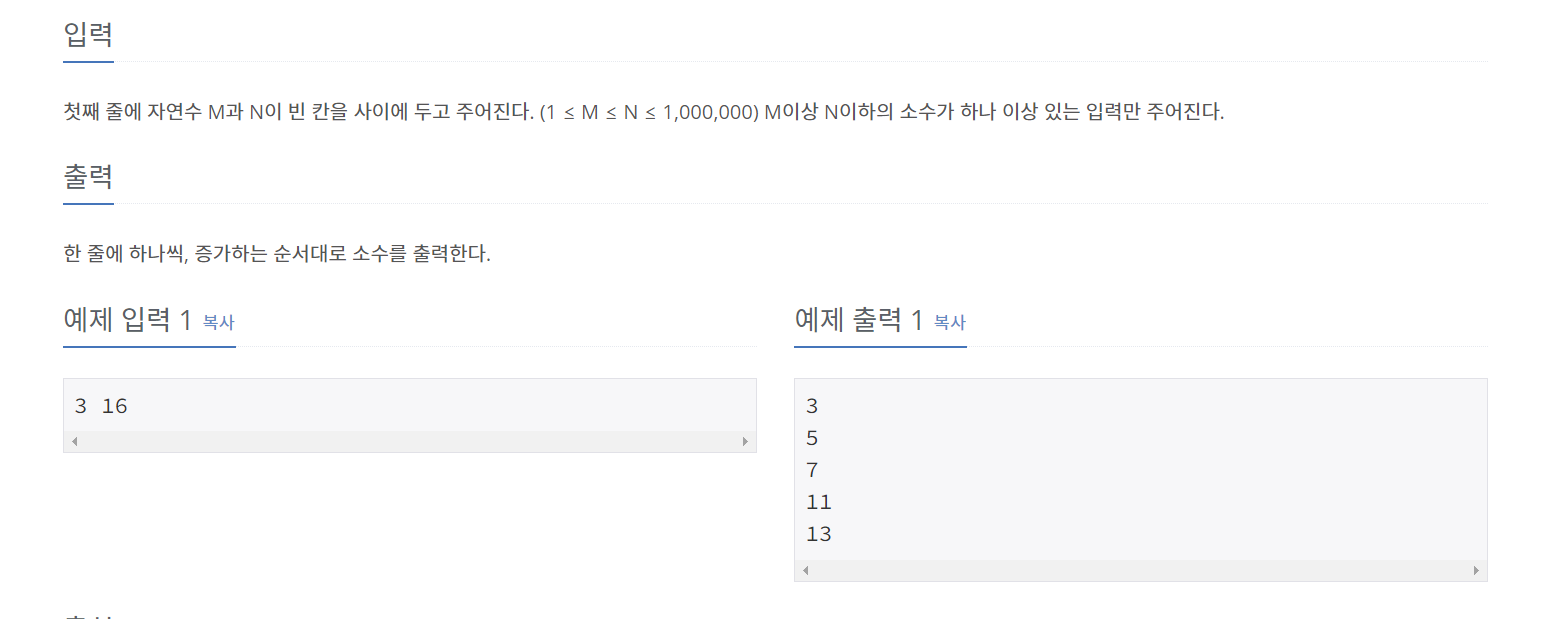 문제는 M이상 N이하의 소수를 모두 출력하는 프로그램을 작성하라네요.
