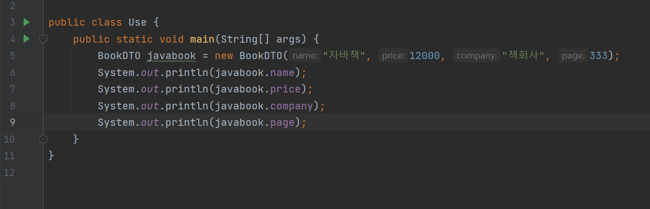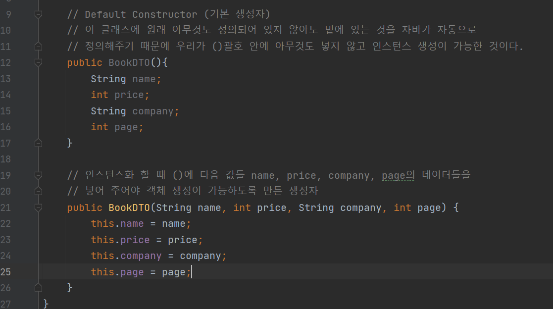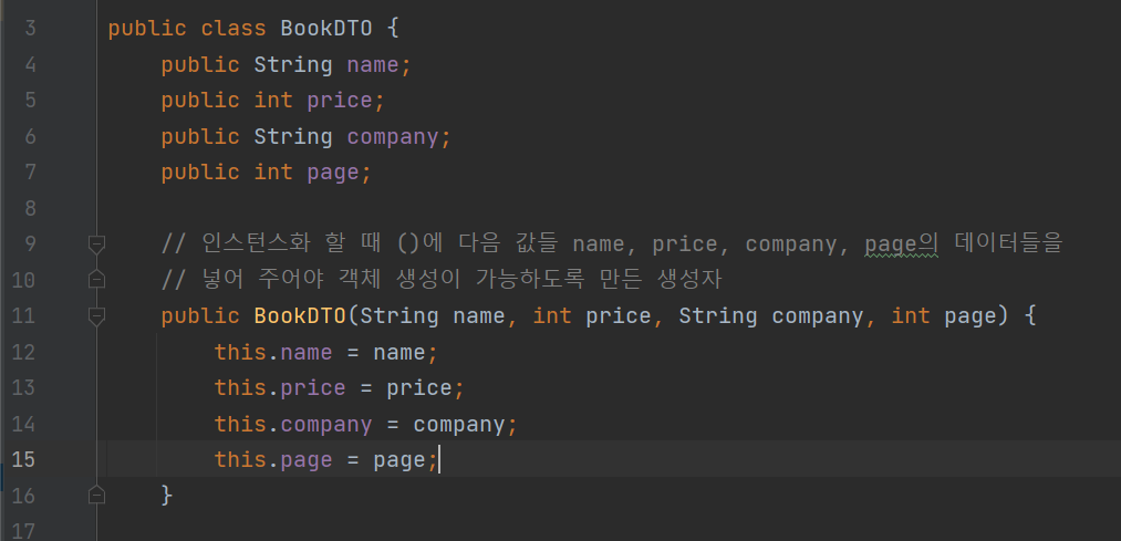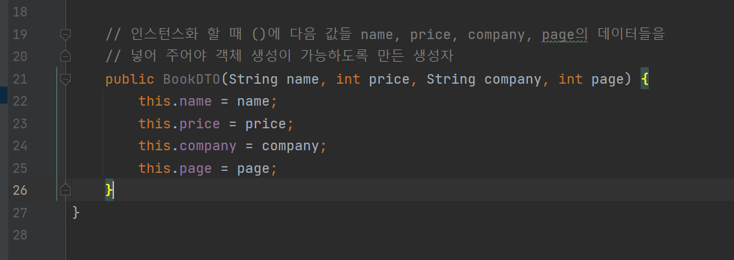 그리고 BookDTO(String name, int price, String company, int page) 파라미터값이 존재하는 생성자가 있습니다.