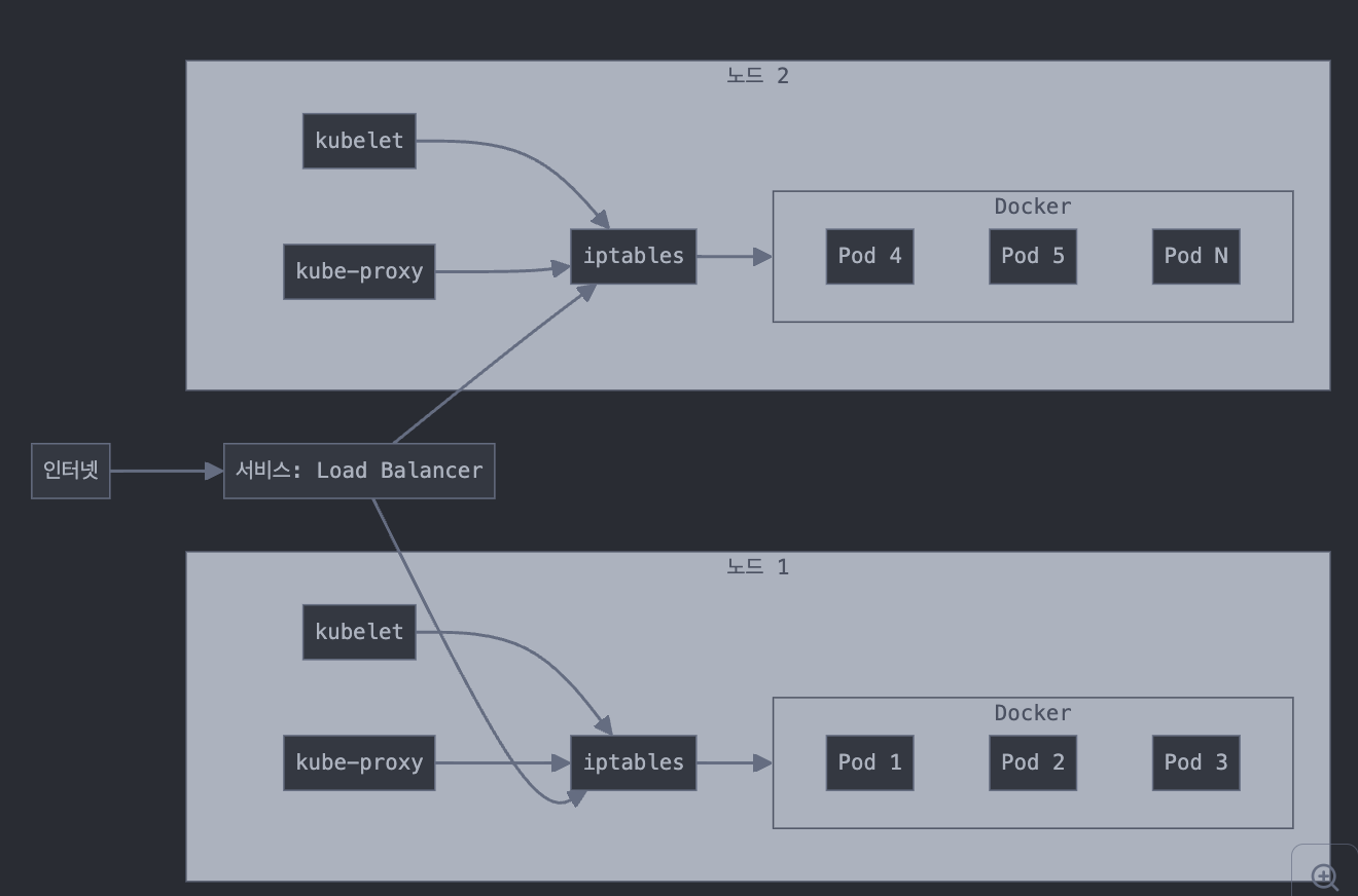 트래픽은 먼저 노드의 iptables로 전달 -> iptables 규칙에 따라 목적지 pod가 있는 노드로 전달 -> 대상 노드의 iptables를 통해 최종 목적지 pod에 도달