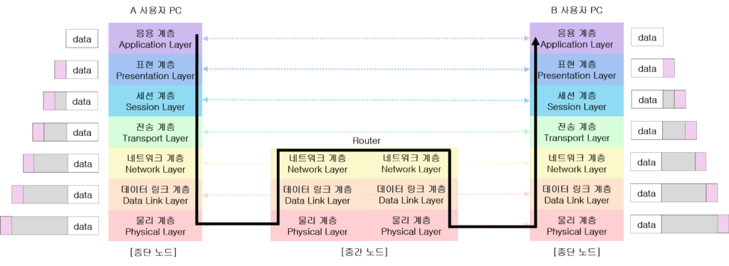 데이터가 전송될 때, 응용 계층에서 시작하여 물리 계층까지 내려가면서 각 계층에서 헤더가 추가돼요. 반대로 수신 측에서는 물리 계층부터 응용 계층까지 역순으로 헤더를 분석하여 데이터를 처리해요. 이렇게 계층별 역할이 구분되면서 네트워크 통신이 이뤄져요.