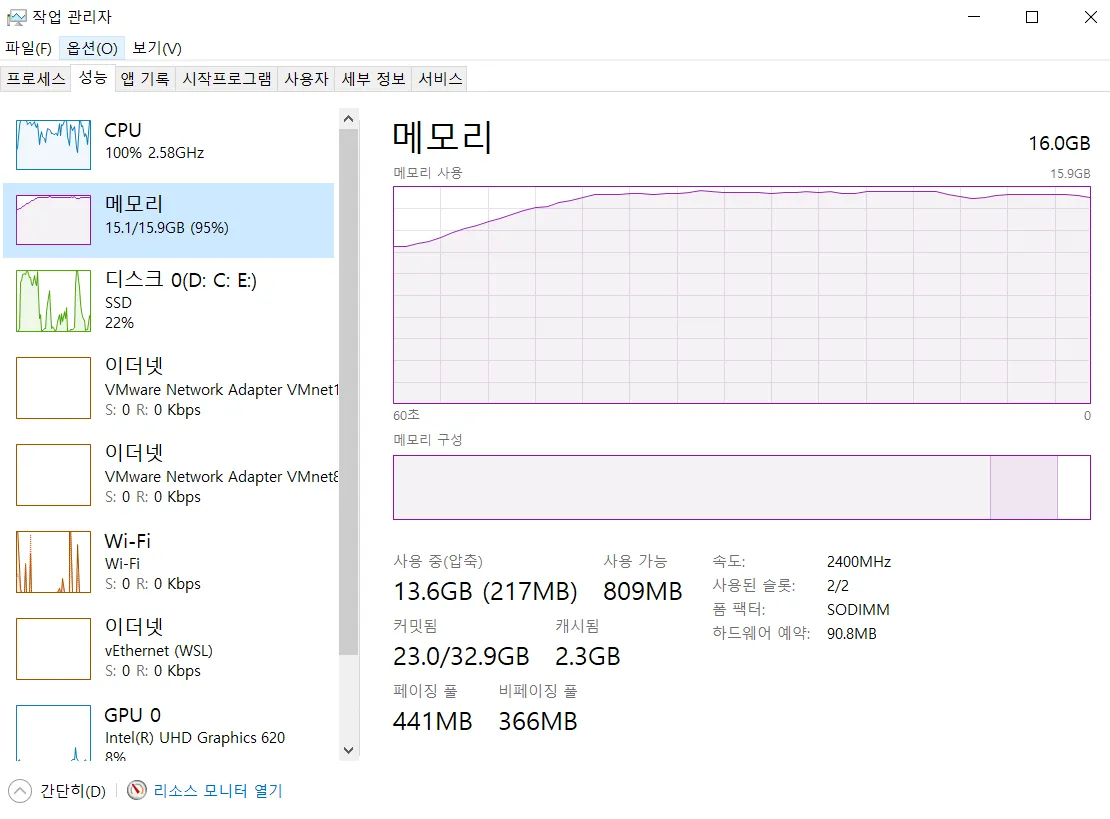 당연히 한번에 많은 데이터를 로드하려니까 제 cpu, memory는 부하가 올 수 밖에 없었습니다.