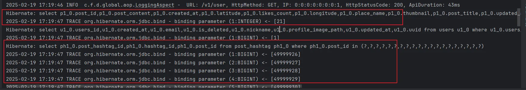 해당 코드는 postId를 가져와서 postId를 기반으로 Hashtag 엔티티, Image 엔티티를 불러오는 로직이 존재합니다.