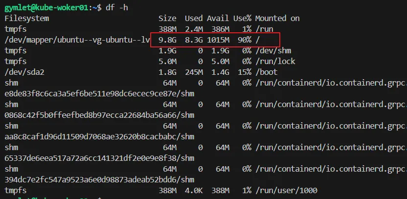 그래서 해결방법은 워커노드의 디스크 용량을 확보하면 되는 것이었습니다.