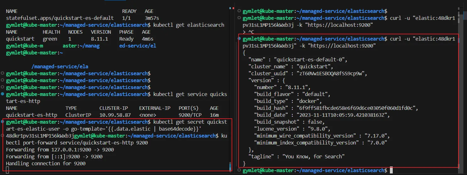 이렇게 비밀번호를 확인하고, 포트포워딩으로 9200번을 열어준 후 curl 명령어로 접근 테스트를 할 수 있습니다.