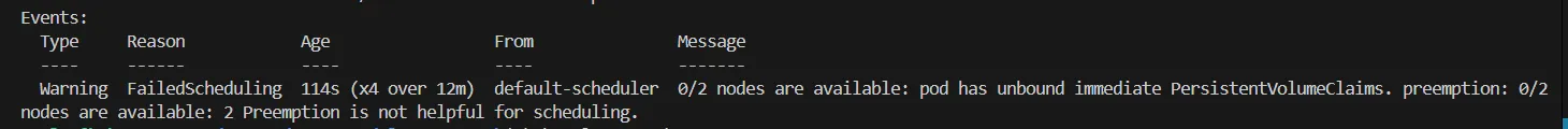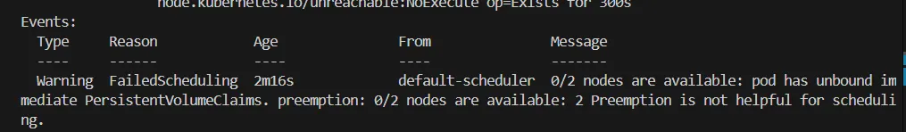 nfs StorageClass를 정상적으로 배포했지만 위와 같은 에러가 발생했다. PV를 자동으로 할당하려는데 이를 할당 할 수 없다는 것이다. 왜냐면 나는 컨트롤 플레인1, 워커노드1 이렇게 구성된 쿠버네티스 클러스터다. 워커노드1에는 현재 디스크 용량이 부족한 상태였고, 컨트롤 플레인은 기본적으로 쿠버네티스 api를 관리하는 곳이기 때문에 엘라스틱 서치 같은 pod는 실행할 수 없도록 Taint가 걸려있다.